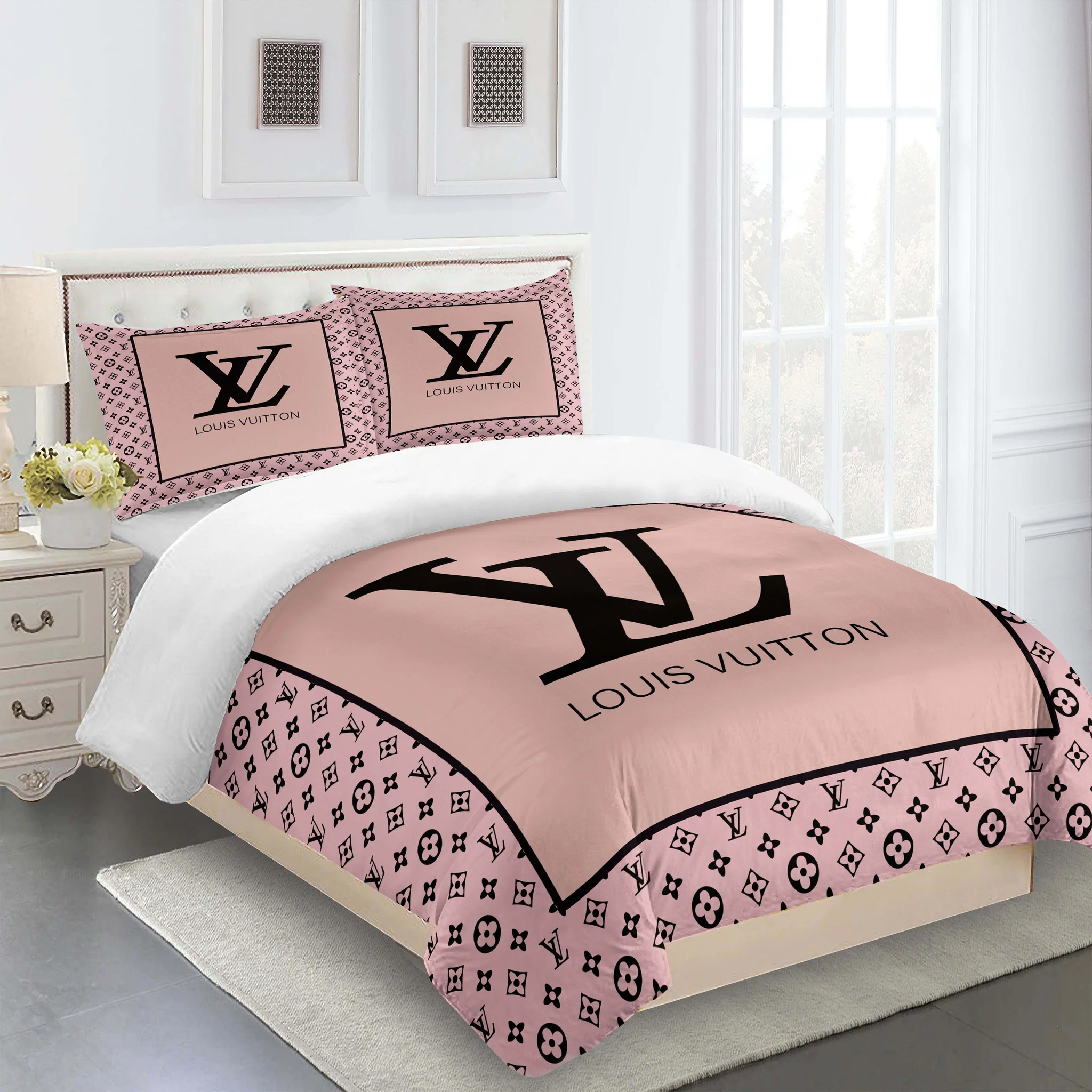 Think about it – you spend about a third of your life in bed. Shouldn’t that time be as comfortable and luxurious as possible? With this beige, pink louis vuitton bedding set, every night feels special. You’re not just going to sleep; you’re retreating to your own personal luxury suite.
