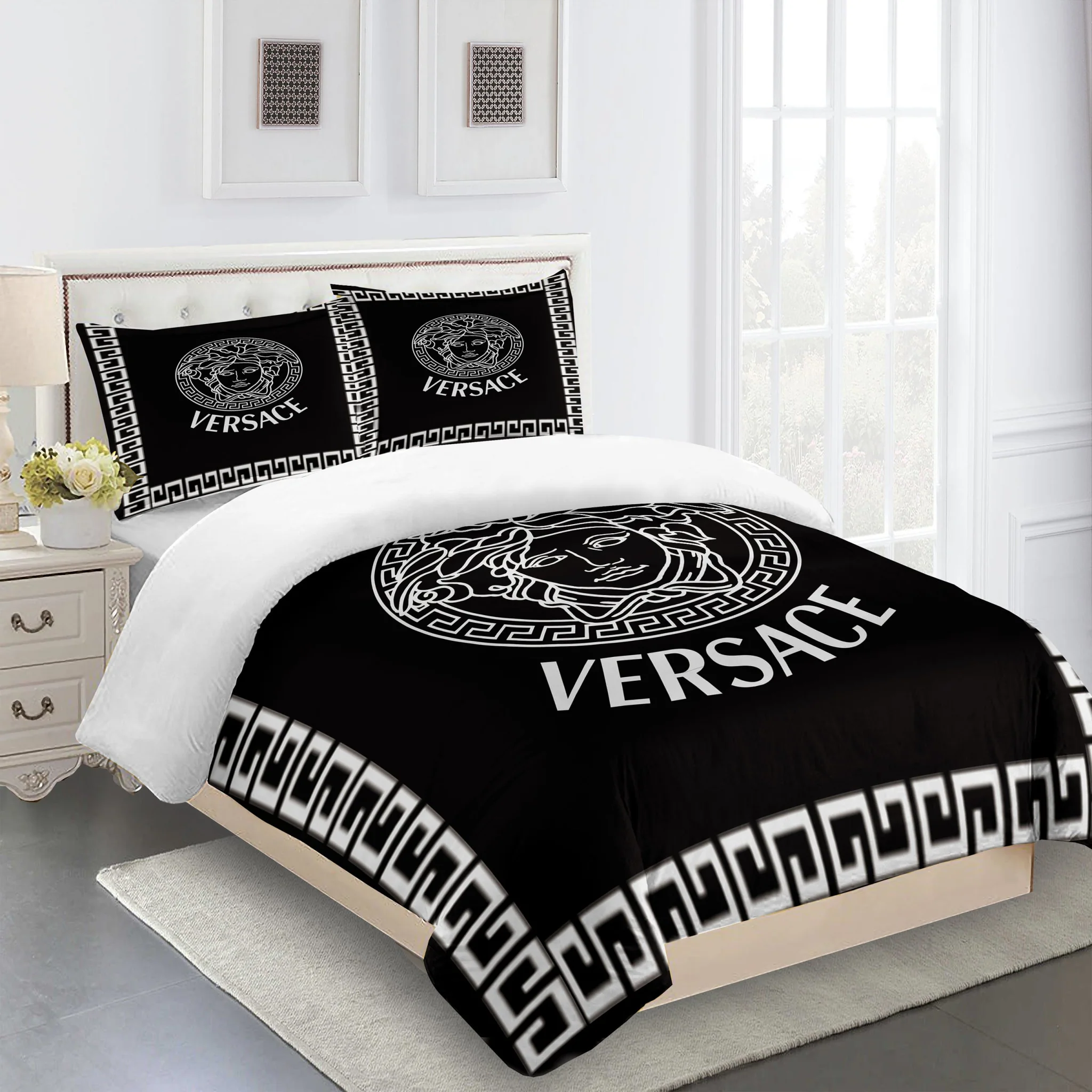 Transform your bedroom into a five-star retreat with our stunning beige,black versace bed set . This isn’t just bedding – it’s an experience. Imagine sinking into incredibly soft, lightweight fabric that feels like a gentle hug at the end of a long day. That’s exactly what you get with this luxurious set.